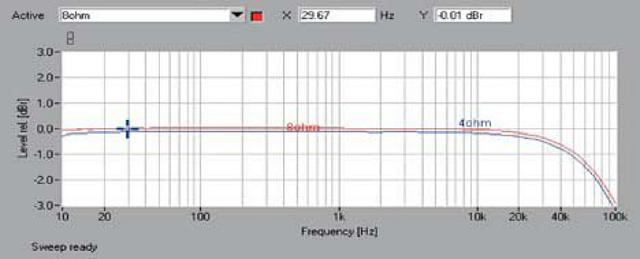 Pasmo przenoszenia (rys.1) prezentuje wzorowe wyrównanie w zakresie niskotonowym, powyżej 20 kHz widać już spadek, ale nie przekracza on -3 dB nawet dla granicznych 100 kHz.