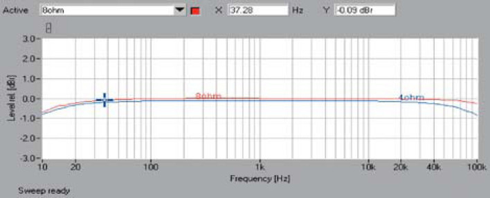 Pasmo przenoszenia (rys.1) wygląda znakomicie, mieszcząc się w granicach 0, -1 dB dla całego badanego przedziału częstotliwości, nieco lepiej w zakresie wysokich tonów wzmacniacz pracuje dla 8 omów, choć i 4 omy utrzymują się przed granicą -1 dB przy górnej częstotliwości 100 kHz.