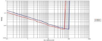 Wykres z rys. 3 potwierdza zarówno niskie zniekształcenia jak i szumy, THD+N jest niższy od 0,1 % już dla początkowych wartości badanych mocy, a od 10 W dla 8 omów i 20 W dla 4 omów przełamuje nawet barierę 0,01%, utrzymując się pod tą linią do obszarów przesterowania.
