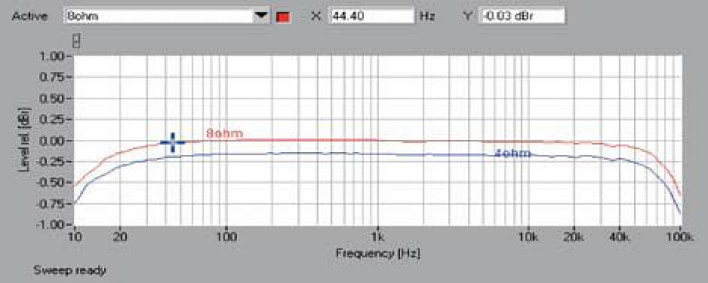 Załączając układ Direct, uzyskaliśmy świetny przebieg pasma przenoszenia (rys. 1), rozciągającego się od 10 Hz do 100 kHz ze spadkiem nie większym niż -0,8 dB przy skrajnych częstotliwościach.