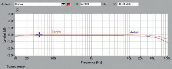 Również pasmo przenoszenia (rys.1) jest niezłe, z łatwością pokrywa zakres od 10 Hz do 100 kHz, gdzie spadek wynosi: 0,6 dB dla 8 omów i -1,2 dB dla 4 omów. Spektrum zniekształceń (rys. 2) zwraca uwagę tylko pojedynczą, trzecią harmoniczną, której poziom sięga -82 dB. Pozostałe leżą już poniżej pułapu -100 dB. Stabilność w perspektywie zmiennych obciążeń potwierdza wykres z rys.3.