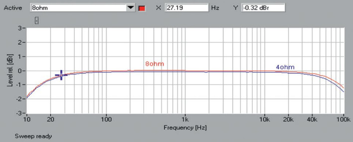 Pasmo przenoszenia (rys. 1) ujawnia lekkie spadki w obszarach najniższych i najwyższych częstotliwości, przy 10 Hz spadek wynosi -1,9 dB, przy 100 kHz ok. -1,5 dB.