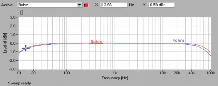 Znakomity w PM8005 jest poziom szumów, wskaźnik S/N wynosi aż 92 dB - to jeden z najlepszych wyników wśród wzmacniaczy zintegrowanych w ogóle. Dzięki temu dynamika też jest świetna - 112 dB. Pasmo przenoszenia (rys.1) oferuje bardzo dobre wyrównanie, przy 10 Hz spadek nie przekracza -1 dB, przy 100 kHz jest podobnie dla 8 omów i tylko minimalnie gorzej (-1,3 dB) dla 4 omów.