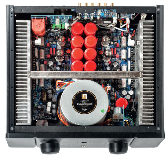 Potężna obudowa ma równie okazałe wnętrze, na które składa się zarówno tranzystorowa końcówka mocy, jak i lampowy przedwzmacniacz. Obudowa nagrzewa się najmocniej przy bocznych ściankach, wzdłuż których niemal na całej głębokości zainstalowano radiatory, w ich górnej części można dojrzeć czujniki termiczne, przygotowane niezależnie dla każdej z końcówek. Z przodu, w ochronnych puszkach, zamknięto transformatory toroidalne, z tyłu umieszczono baterię ośmiu kondensatorów fi ltrujących.