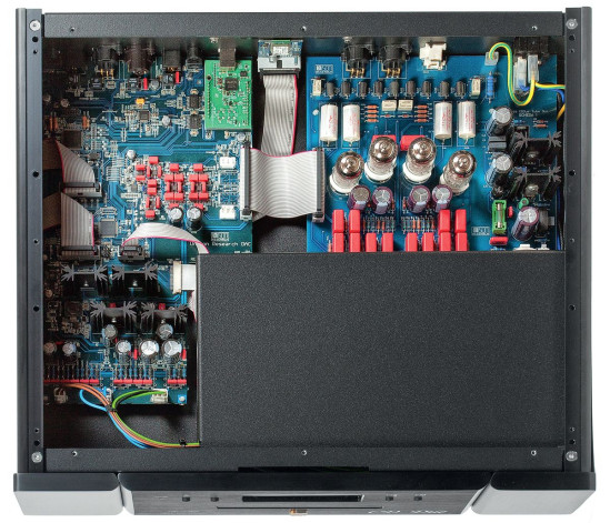 W sekcji wyjściowej producent rozwija swoje ulubione, lampowe skrzydła, pracują tutaj podwójne triody 12AX7, wśród elementów biernych znajdują się kondensatory Mundorfa.