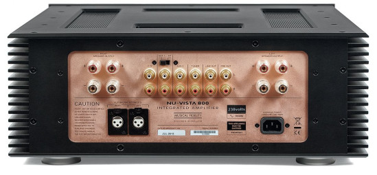 Musical Fidelity Nu-Vista 800 ma cztery wejścia liniowe RCA, jedno z nich można zamienić w wejście na końcówkę mocy (aby ułatwić integrację z systemami wielokanałowymi). Jest jeszcze wyjście niskopoziomowe z przedwzmacniacza (regulowane) oraz nieregulowane, magnetofonowe. Wszystkie gniazdka RCA są wyjątkowo solidne, wkręcane w tylną płytę. Jest też pojedyncze wejście XLR, ale nie jest ono początkiem zbalansowanej ścieżki sygnału.