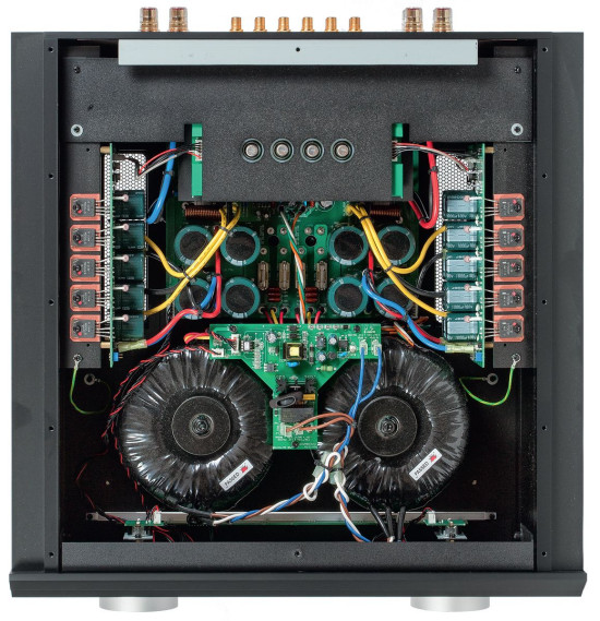 Rozdzielenie kanałów ma oczywiście kontynuację w budowie końcówek mocy; każda z nich jest kompletnym, niezależnym modułem, przykręconym poprzez kształtowniki do ścianek bocznych. Przeniesiono do nich także część kondensatorów wygładzających napięcie zasilania, lokując w ten sposób bank energii możliwie najbliżej "odbiornika".