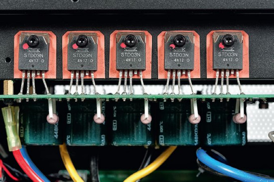 Widoczne na górnych ściankach "okna" znajdują się nad tranzystorami końcówek, a żeby chłodzenie było jeszcze bardziej wydajne, to szczeliny znajdują się także w dolnej płycie. W każdym kanale Musical Fidelity Nu-Vista 800 użyto aż dziesięciu tranzystorów firmy Sanken, są to układy Darlingtona z wbudowaną kompensacją temperatury, o oznaczeniach STD03N/P.