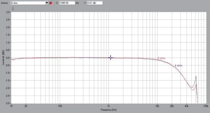 Również charakterystyki częstotliwościowe (rys.1) są zwykle problemem dla klasy D, a dla Hypexa, i tym samym Marantza - już nie. Przy 20 kHz spadek wynosi tylko -0,5 dB, a -3 dB odnotujemy przy ok. 70 kHz. Co jednak najważniejsze, nie widać tendencji do wzbudzania się, a charakterystyki dla obydwu impedancji obciążenia są podobne.
