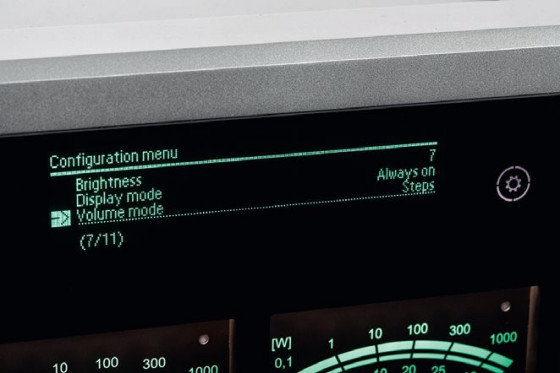 Wyświetlacz poinformuje nas o wybranym źródle, poziomie głośności i wielu innych faktach "z życia wzmacniacza", po części związanych z panelem konfiguracyjnym. Wejście do menu ustawień wyzwala jeden z dwóch sensorów dotykowych, drugi to zakamuflowany włącznik zasilania.