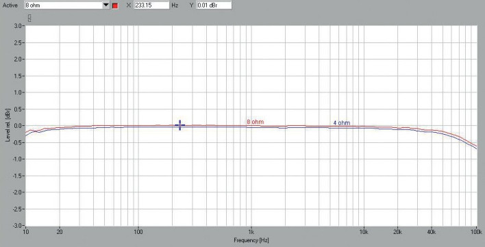 Specyfikacja firmowa nie obiecuje wielkich mocy, 2 x 50 W przy 8 Ω i 2 x 85 W przy 4 Ω. W rzeczywistości (do której należy nasze Laboratorium) pojawia się znaczenie więcej – odpowiednio 2 x 85 W i 2 x 119 W.