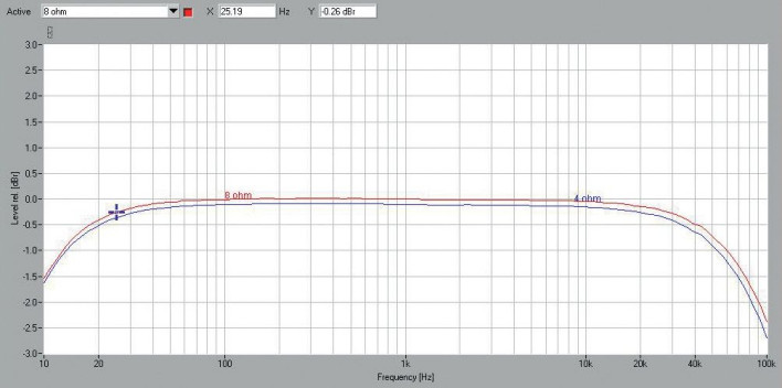 Potwierdzeniem znakomitej kondycji urządzenia jest także rys. 3. W pewnym zakresie mocy THD+N schodzą poniżej nie tylko 0,1%, ale nawet 0,01% (powyżej 4 W dla 8 Ω i 7 W dla 4 Ω). To charakterystyki dla klasy AB, a dodatkowy pomiar dla klasy A wykonaliśmy przy obciążeniu 8 Ω (kolor czarny); do punktu znacznie wcześniejszego przesterowania charakterystyka niemal idealnie pokrywa się z pracą w klasie AB.