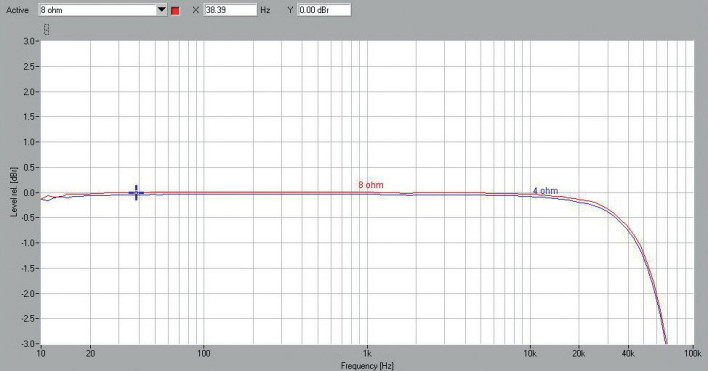 Również dlatego odstęp od szumu jest umiarkowany (77 dB), a dynamika nie dociągnęła do 100 dB (98 dB). Charakterystyki częstotliwościowe (rys. 1) nie budzą większych zastrzeżeń, spadek -3 dB pojawia się przy 68 kHz zarówno dla 8, jak i dla 4 Ω.