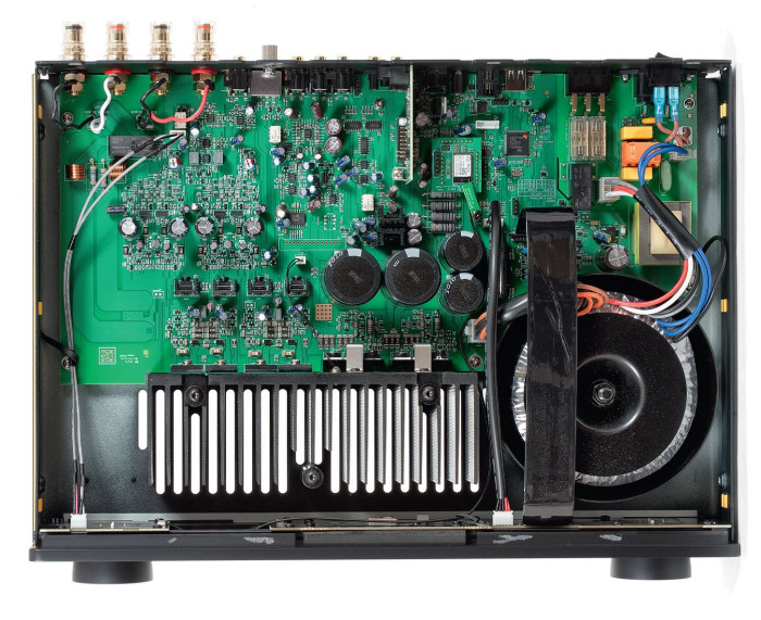 Do Arcama A25 trafiła już piąta generacja firmowych końcówek mocy w klasie G. W każdym kanale nadal pracuje jedna para tranzystorów wyjściowych, tuż obok niej widać rozbudowany zasilacz z niezależnymi obwodami dla dwóch głównych gałęzi – niskiego i wysokiego napięcia (to podstawa pracy układu w klasie G).