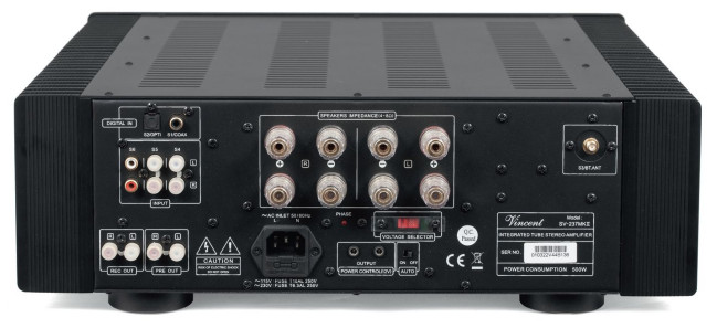 Wejścia analogowe są trzy, wszystkie liniowe (szkoda, że nie ma wejścia gramofonowego). Są też dwa wyjścia liniowe ze stałym i zmiennym poziomem. Kolumny podłączymy do dwóch par zacisków. Można odłączyć system automatycznego czuwania (zasilania), a dla purystów Vincent ma sygnalizację tzw. "fazy", czyli poprawności doprowadzenia do wzmacniacza żyły fazowej.