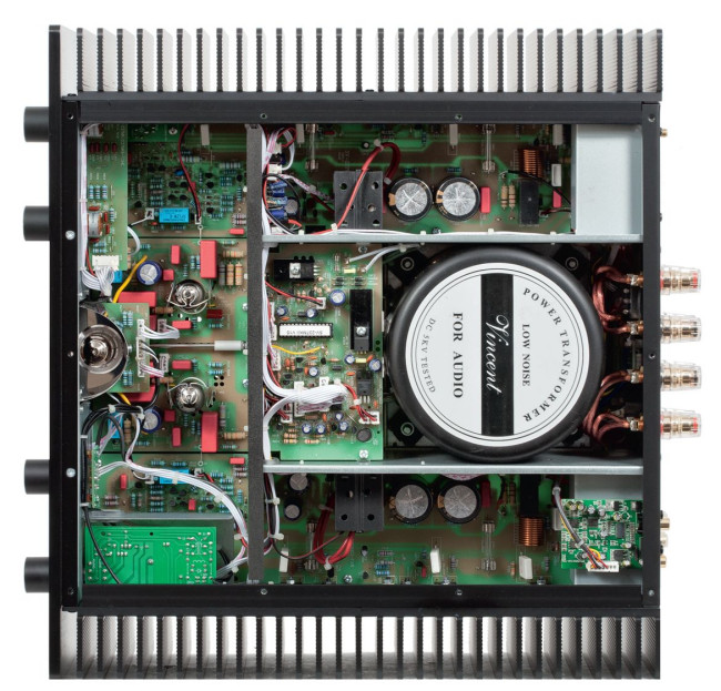 Vincent SV-237MKII waży ponad 20 kg, a jego uporządkowane wnętrze i jakość podzespołów robią wrażenie. Zarówno sekcje końcówek mocy (zajmują boczne części, przy radiatorach), przedwzmacniacz (z przodu, przy przedniej ściance), jak też zasilacz i przetwornik C/A są od siebie odseparowane pionowymi, grubymi ekranami. Płyty nie tylko dzielą, ale też wzmacniają mechanicznie obudowę.