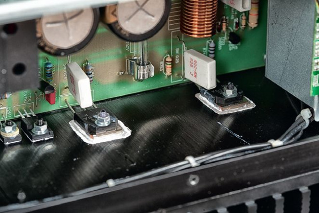 Duży (i dodatkowo ekranowany) transformator toroidalny jest umieszczony z tyłu. W każdym kanale pracują dwie pary tranzystorów wyjściowych, sprawdzonych Sankenów 2SA1386/2SC3519. Tworzą potencjał wystarczający, aby wygenerować deklarowaną przez producenta moc wyjściową (2 x 150 W przy 8 Ω i 2 x 250 W przy 4 Ω) i pracować w klasie A w zadeklarowanym zakresie mocy.