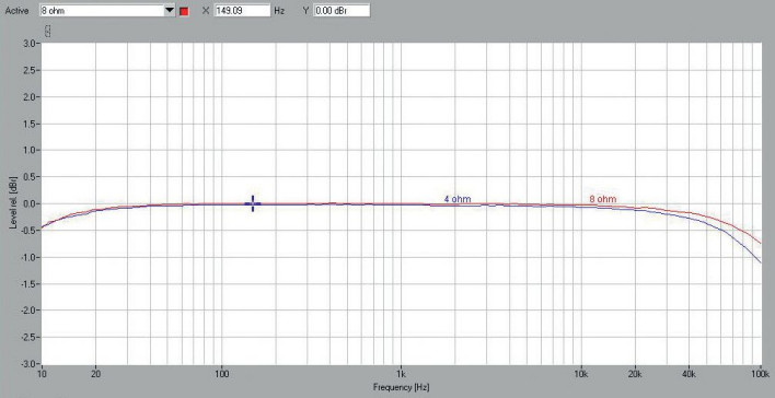Charakterystyki częstotliwościowe (rys. 1) wyglądają bardzo dobrze, na nich też nie widać żadnych kaprysów sekcji lampowej. Spadek przy 10 Hz to zaledwie -0,4 dB, a przy 100 kHz -0,7 dB dla 8 Ω i -1,2 dB dla 4 Ω.
