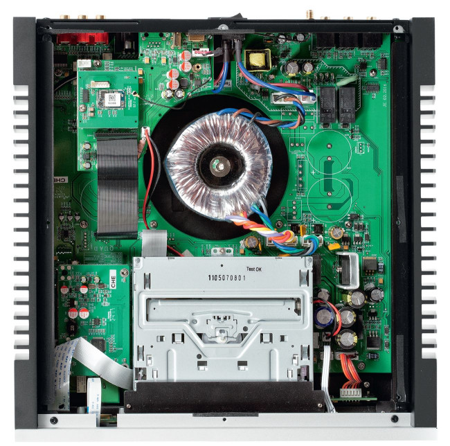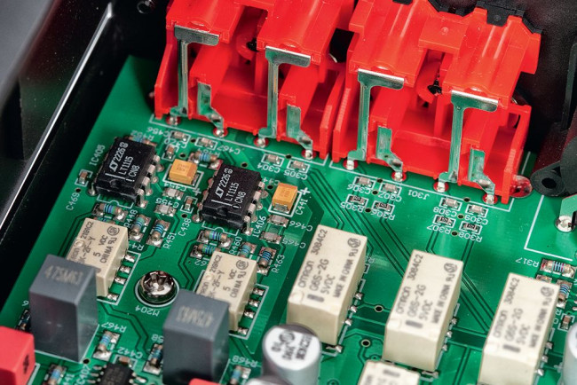 Sekcja gramofonowa opiera się na układach scalonych (są tam wysokiej jakości wzmacniacze operacyjne Analog Devices LT1115) i precyzyjnych elementach pasywnych (korekcja RIAA). Sygnały ze wszystkich wejść trafiają do przekaźników. Nowoczesna regulacja głośności (przez panel dotykowy) wymagała adekwatnych rozwiązań układowych.