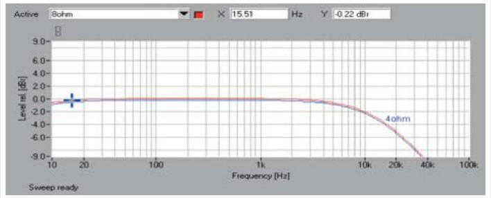 Pasmo przenoszenia (rys.1) jest tylko delikatnie ograniczone od strony niskich częstotliwości (-0,6 dB przy 10 Hz), ale niestety wyraźnie opada już powyżej 4 kHz, przecinając linię -3 dB bardzo wcześnie, bo przy 14 kHz.