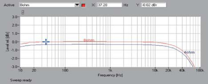 Pasmo przenoszenia (rys. 1) przekonuje, że wzmacniacz nie ma najmniejszych problemów w zakresie niskotonowym (-0,2 dB przy 10 Hz), nieco słabiej spisuje się powyżej 20 kHz, spadek -3 dB mamy przy 74 kHz. Widać także różnicę współczynnika wzmocnienia pomiędzy badanymi impedancjami.