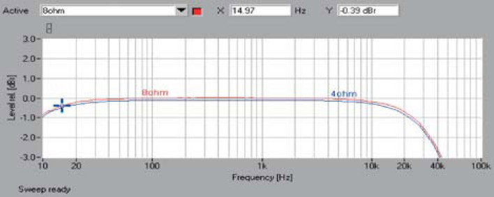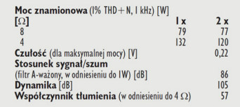 Poziom szumów wzmacniacza to -86 dB, dynamika osiąga 105 dB. Pasmo przenoszenia (rys.1) jest ograniczone: przy 10 Hz spadek wynosi zaledwie -1 dB, ale na drugim skraju obniżanie zaczyna się już od 10 kHz, a punkt -3 dB pojawia się przy wczesnych 42 kHz.