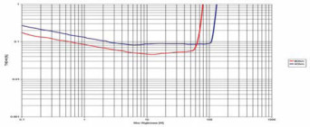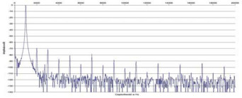 W spektrum zniekształceń (rys. 2) wyraźnie dominują nieparzyste harmoniczne na czele z trzecią (-71dB), której wtórują piąta (-81 dB), siódma (-78 dB) oraz dziewiąta (-88 dB). Kolejne są wprawdzie również widoczne, jednak pojawiają się już poniżej -90 dB. Do grona najbardziej widocznych parzystych zaliczymy drugą (-69 dB) oraz czwartą (-86 dB).