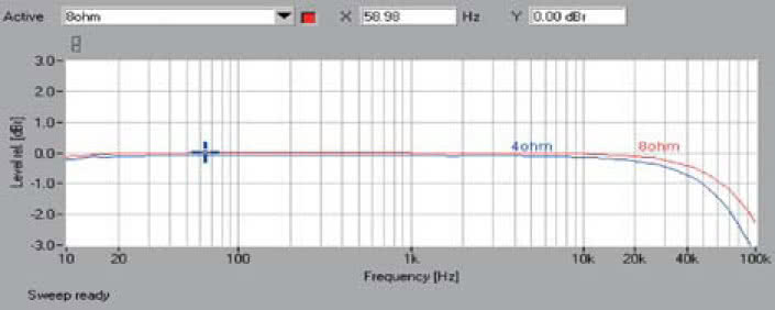 A jest się czym przejmować, bo z niewielkiej skrzynki Kandy ma (zgodnie z deklaracjami producenta) płynąć moc niemal 2 x 200 W przy 4 omach. Producent wprawdzie zaleca stosowanie kolumn 8-omowych, lecz nie zabrania też podłączania 4-omowych.