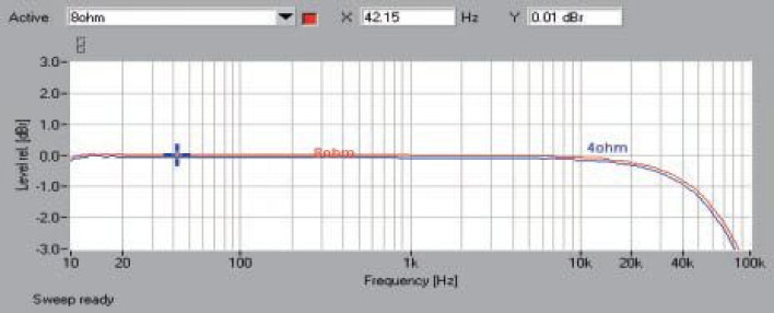 Poziom szumów nie jest najniższy - wynosi -82 dB, ale dzięki wysokiej mocy dynamice udało się dotrzeć do poziomu 102 dB. stabilną pracę i dobrą kontrolę basu zapewnia wysoki współczynnik tłumienia - 116. Pasmo (rys.1.) rozciągające się od 10 do 20 kHz jest absolutnie idealne, jednak powyżej rozpoczyna się już wyraźny spadek, wraz z 8 omami punkt -3 dB wyznaczamy przy 88 kHz, wraz z 4 omami - przy 82 kHz.