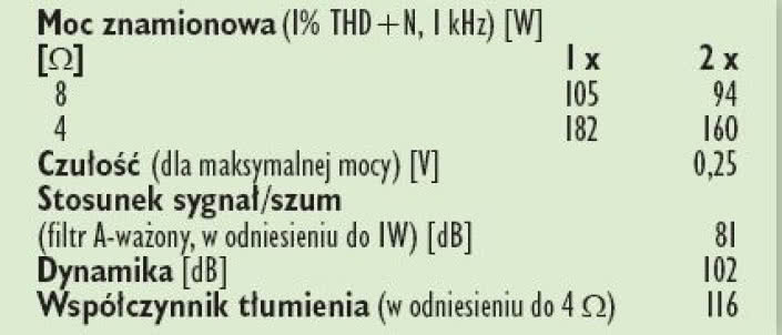 Wzmacniacz ma moc 105 W przy 8 omach oraz 182 W przy 4 omach - jak na integrę to więcej niż dobry wynik, tym bardziej że producent obiecuje "tylko" 90 W oraz 140 W. Przy wysterowaniu obydwu kanałów uzyskujemy odpowiednio 2 x 94 W i 2 x 159 W (8 i 4 omy). Na wejściu CD czułość wynosiła 0,25 V.