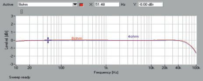 Pasmo przenoszenia (rys.1) rozciąga się od 10 Hz (-0,1 dB) utrzymując idealną liniowość do ok. 50 kHz, przy granicznych 100 kHz spadek nie przekracza -1,6 dB. Nie ma przy tym znaczenia, z jaką impedancją pracuje Denon. Jedyną wartą odnotowania harmoniczną w przedstawionym na rys. 2. spektrum jest trzecia, ale jej poziom to niskie -91 dB.
