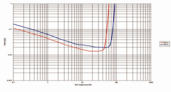 Zaletą wzmacniacza są niskie zniekształcenia THD+N w szerokim zakresie mocy wyjściowej, co widać na rys. 3. Już dla niespełna 0,2 W i 8 omów THD+N jest niższe od 0,1 %, przy 4 omach wystarczy moc powyżej 0,35 W.