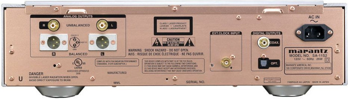 Są też trzy wyjścia cyfrowe - RCA i optyczne, a także wejście cyfrowe na BNC; to ostatnie nie służy jednak przesyłaniu do Marantza SA-11S2 sygnału audio, ale do transmisji sygnału z zewnętrznego zegara. Brak wejścia cyfrowego audio w tak wypasionym odtwarzaczu jest już uchybieniem - niemal wszystkie inne firmy takie wejścia oferują.