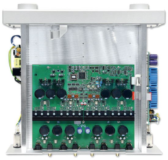 zajmuje sekcję dolną, w towarzystwie dekoderów i obwodów wejść cyfrowych, po bokach widać dwa kompletne zasilacze - dla części analogowej oraz cyfrowej.