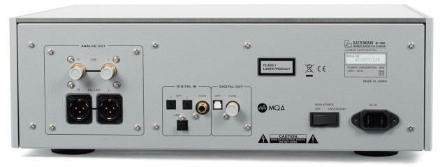 Unikalną cechą mechanizmu Luxmana D-10X są dodatkowe drzwiczki przed tacką szuflady. Cały mechanizm działa bezbłędnie i jest cichutki. Sygnał analogowy odbierzemy z dwóch par wyjść – RCA i XLR.