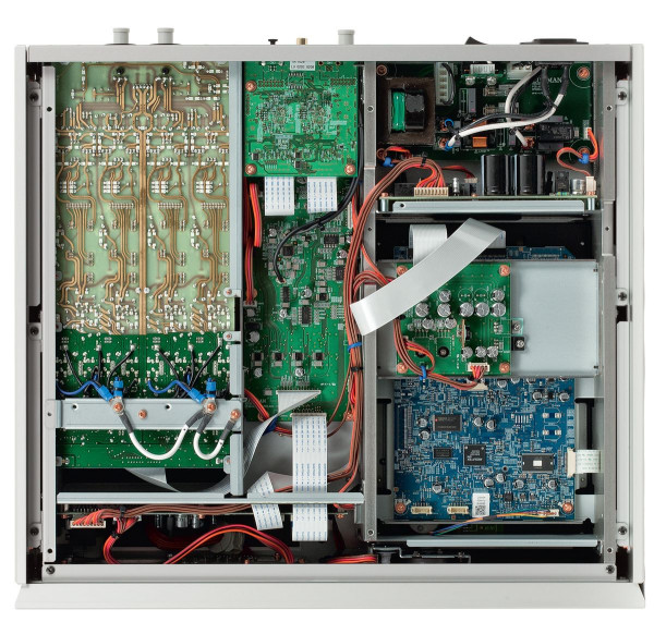 W Luxmanie D-10X uruchomiono dwa takie przetworniki – po jednym na kanał – więc można mówić o układzie dual-mono (w tej sekcji), zbalansowany sygnał powstaje już na etapie konwersji cyfrowo-analogowej. Dalej tafia on do osłoniętych pionową "grodzią" modułów analogowych.