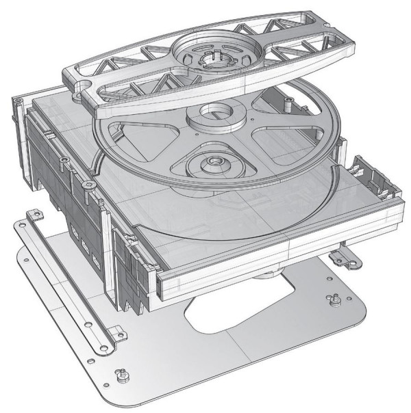 Płyta spoczywa na okrągłej platformie, do której dociskana jest górnym krążkiem (o średnicy zbliżonej do średnicy płyty). Wyjątkowość polega na tym, że krążek przylega do płyty na większej powierzchni (a nie tylko, jak w typowym napędzie, tylko w centrum).