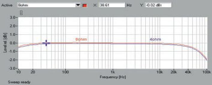 Pasmo przenoszenia (rys.1) jest opanowane, przy 10 Hz spadek wynosi -0,5 dB, przy 100 kHz wciąż umiarkowane -2 dB.