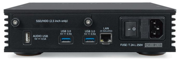 Drugi sposób dostarczenia muzycznego "towaru" to interfejs sieciowy LAN służący również do wszystkich innych zadań strumieniowych. Nie znajdziemy żadnej anteny ani na zewnątrz, ani wewnątrz, bo Aurender konsekwentnie unika standardów Wi-Fi oraz Bluetooth (przewodowa sieć LAN oznacza lepszą stabilność i wyższą przepustowość).