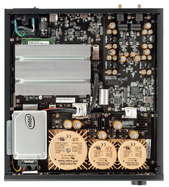 We wnętrzu Aurendera A100 widać sporo konotacji komputerowych. Przypomina je cała sekcja procesorów z blokiem chłodzenia, nieopodal widać charakterystyczną aranżację dysków twardych - to ułożone piętrowo jednostki 2,5 cala, dysk talerzowy oraz SSD od Intela.