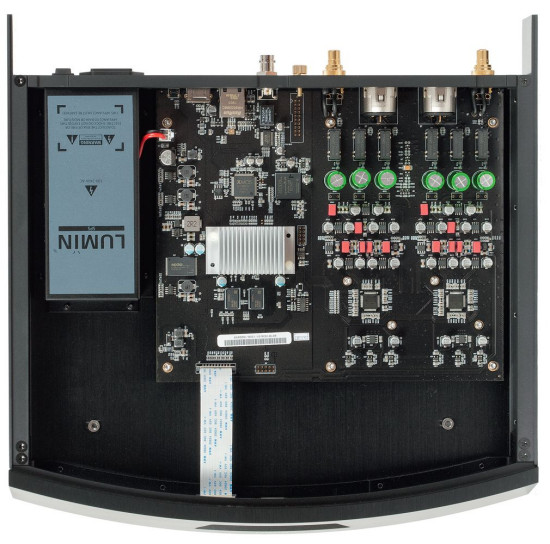 Główną płytkę podzielono na dwie części. Lewa obejmuje elektronikę cyfrową, moduły sieciowe i potężny procesor (widać na nim “narośl" radiatora). Prawa - to dwie sekcje odpowiadające już kanałom L/P - każdy ma swój własny DAC i zbalansowaną sekcję analogową.