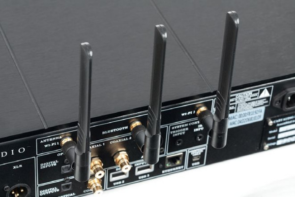 Na froncie są jednak dwa nowoczesne złącza dla nośników pamięci, raczej przenośnych – czytnik kart pamięci SD i USB. Z tyłu mamy do dyspozycji dwa kolejne złącza USB (nadal dla nośników pamięci, żadne z nich nie wpisuje się w formułę USB-DAC), sieciowy LAN, a dla komunikacji bezprzewodowej aż trzy anteny – dwie dla Wi-Fi i jedną dla Bluetooth.