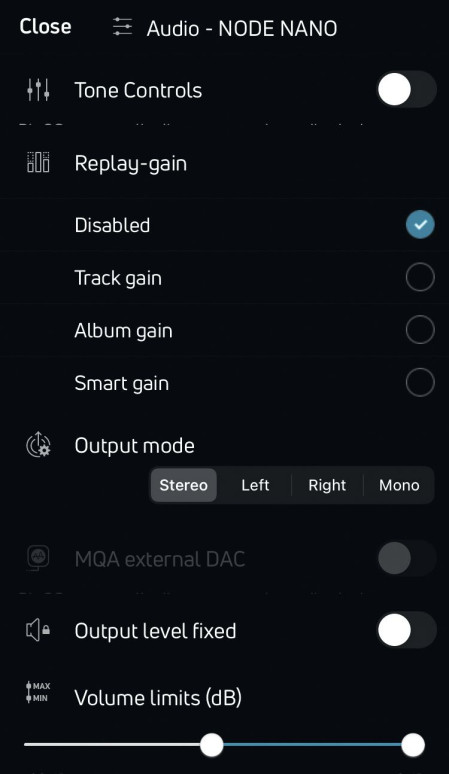 Ani teraz, ani w przyszłości Bluesound Node Nano nie wykorzysta w pełni takich możliwości, nie zanosi się również na włączenie do menu kilku charakterystyk filtrowania (przetwornik ma ich w sumie aż 9). Wydaje się to racjonalną decyzją w kontekście priorytetu nieskomplikowanej obsługi, natomiast istotna (niezależnie od zabawy w filtry) jest imponująca dynamika zastosowanego układu, sięgająca aż 130 dB.
