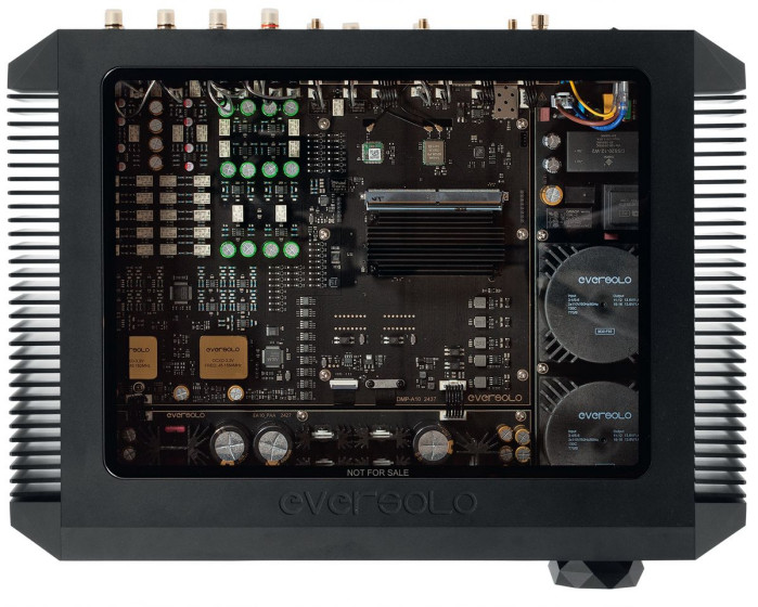 Eversolo DMP-A10 ma dwa zasilacze oparte na dwóch ekranowanych transformatorach (toroidalnych), niezależnych dla sekcji cyfrowej i analogowej. Jest jeszcze trzeci, najmniejszy transformator, prawdopodobnie dla układu czuwania lub/i sterowania.