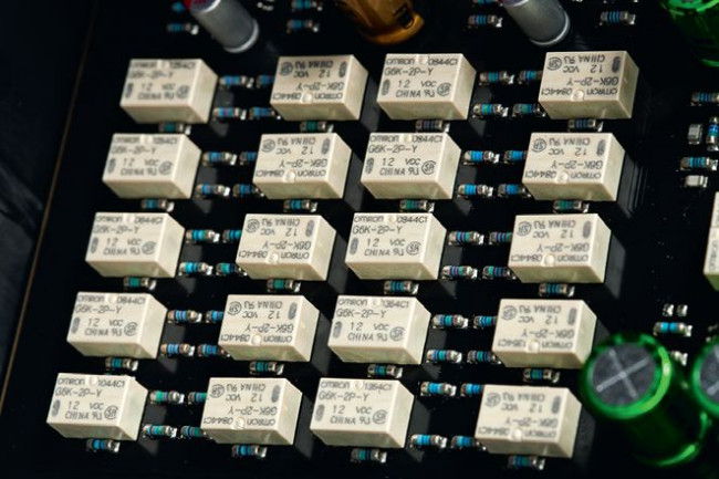 Efektownie wyglądają złote obudowy kondensatorów. Sygnał z gniazd wejściowych trafia na mniejszą płytkę z intrygującymi puszkami "EverSolo Ultra Low Noise Pre-Amp Module", w których znajdują się prawdopodobnie układy wzmocnienia wstępnego (Eversolo AMP-F10 nie ma przecież tradycyjnie rozumianego przedwzmacniacza); tam też mieszczą się układy desymetryzujące napięcie z wejść XLR, bowiem dalszy bieg sygnału nie jest symetryczny.
