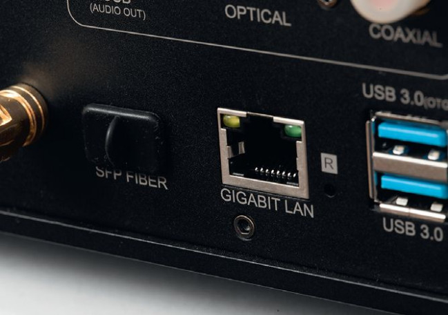 Trzy wyjścia cyfrowe to współosiowe, optyczne i USB dla zewnętrznego przetwornika. Czas na sieć, w której znajdzie się i standardowy, gigabitowy LAN, a także polecane przez producenta połączenie optyczne, wolne od sieciowych zakłóceń.