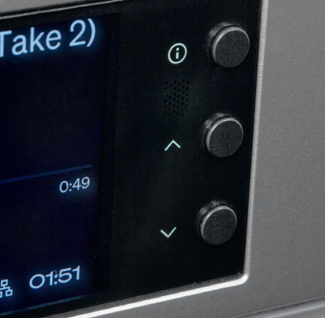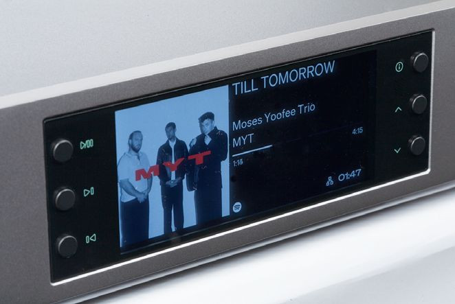 Centralnie ulokowano kolorowy wyświetlacz; nieco większy niż poprzednio i o wyższej rozdzielczości. Pokaże okładki, podstawowe informacje tekstowe i bardziej zaawansowane detale techniczne (o przetwarzanym sygnale). Nie jest dotykowy, CXN100 wciąż obsługuje się hajfajowo, a nie smartfonowo. Przyciski pozwalają na sterowanie odtwarzaniem, jest też pokrętło regulacji głośności – o ile taką funkcję włączymy.
