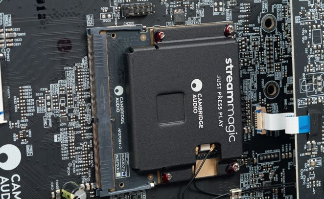 Nowy moduł platformy strumieniowej jest dokręcony do głównej płytki drukowanej, a na jego ekranie znajduje się napis Just Press Play – tak właśnie CXN100 działa, bez skomplikowanych funkcji i mnóstwa regulacji.
