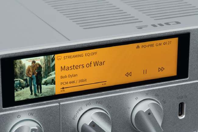 Gdy używamy FiiO K17 jako przedwzmacniacz lub DAC czy przeglądamy ustawienia, jest stonowany, niemal wyłącznie tekstowy; warstwa graficzna wchodzi do gry w trybie sieciowym, a matryca nabiera kolorów (dosłownie) i prezentuje między innymi okładki płyt. Menu jest dość obszerne, w zakresie audio pozwala na wybór filtrów cyfrowych (6 trybów), ograniczanie głośności i korekcję charakterystyki częstotliwościowej.
