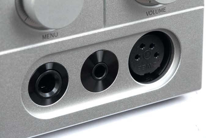 Poniżej znajduje się włącznik zasilania oraz dwa obrotowe przełączniki funkcji sekcji analogowej. Pierwszy z nich to selektor wyjść (liniowe z przedwzmacniacza, słuchawkowe – w dowolnych kombinacjach), pozwala też pominąć regulację głośności. Drugi zajmuje się sekcją słuchawkową, dopasowując wzmocnienie układu. Dwa kolejne pokrętła to nawigacja po menu oraz ustalanie głośności.